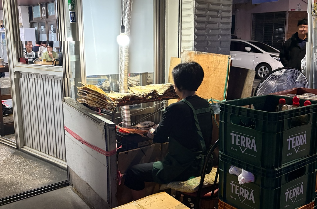 입구에 계속 연탄불에 황태포를 굽고 계셨음.......